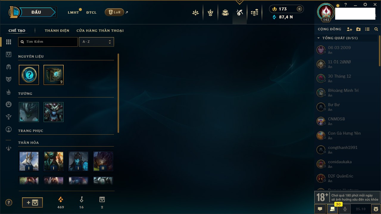 Rank Đơn: Vàng IIIKhung: VàngTướng: 171 - Còn 212486 THXTrang Phục: 201Rank ĐTCL: Bạc ILinh Thú: 79