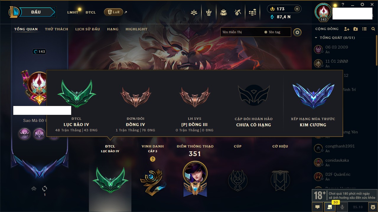 Rank Đơn: Bạc IVKhung: BạcTướng: 171 - Còn 173918 THXTrang Phục: 233Rank ĐTCL: Lục Bảo IIILinh Thú: 26
