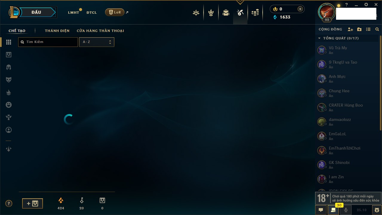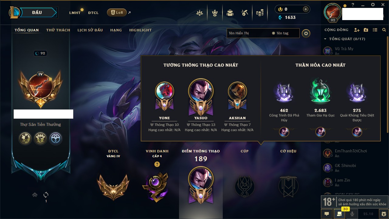 Rank Đơn: Vàng IVKhung: Chưa có khungTướng: 170 - Còn 27840 THXTrang Phục: 77Rank ĐTCL: Chưa RankLinh Thú: 143