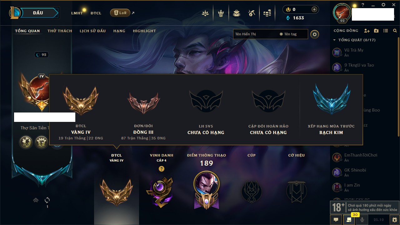 Rank Đơn: Vàng IVKhung: BạcTướng: 171 - Còn 116977 THXTrang Phục: 142Rank ĐTCL: Đồng IILinh Thú: 97