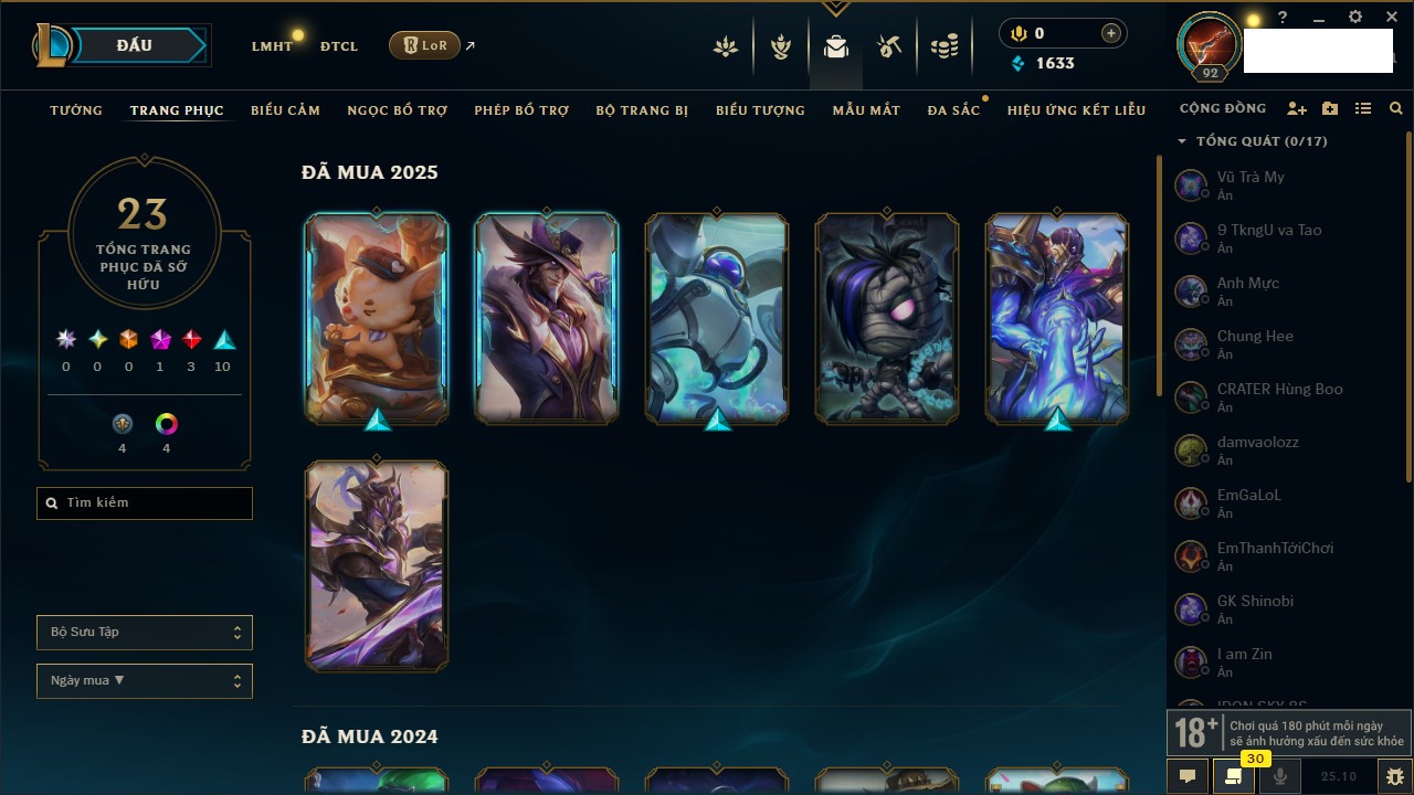 Rank Đơn: Vàng IVKhung: VàngTướng: 158 - Còn 85629 THXTrang Phục: 163Rank ĐTCL: Chưa RankLinh Thú: 177