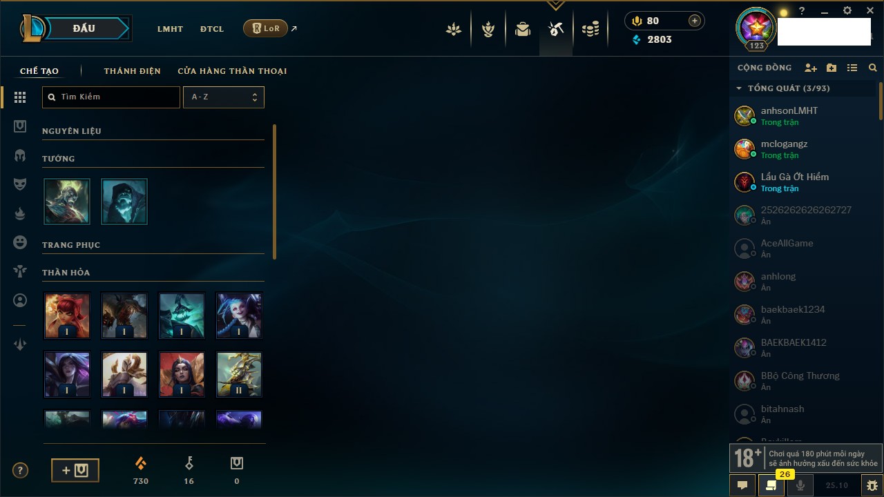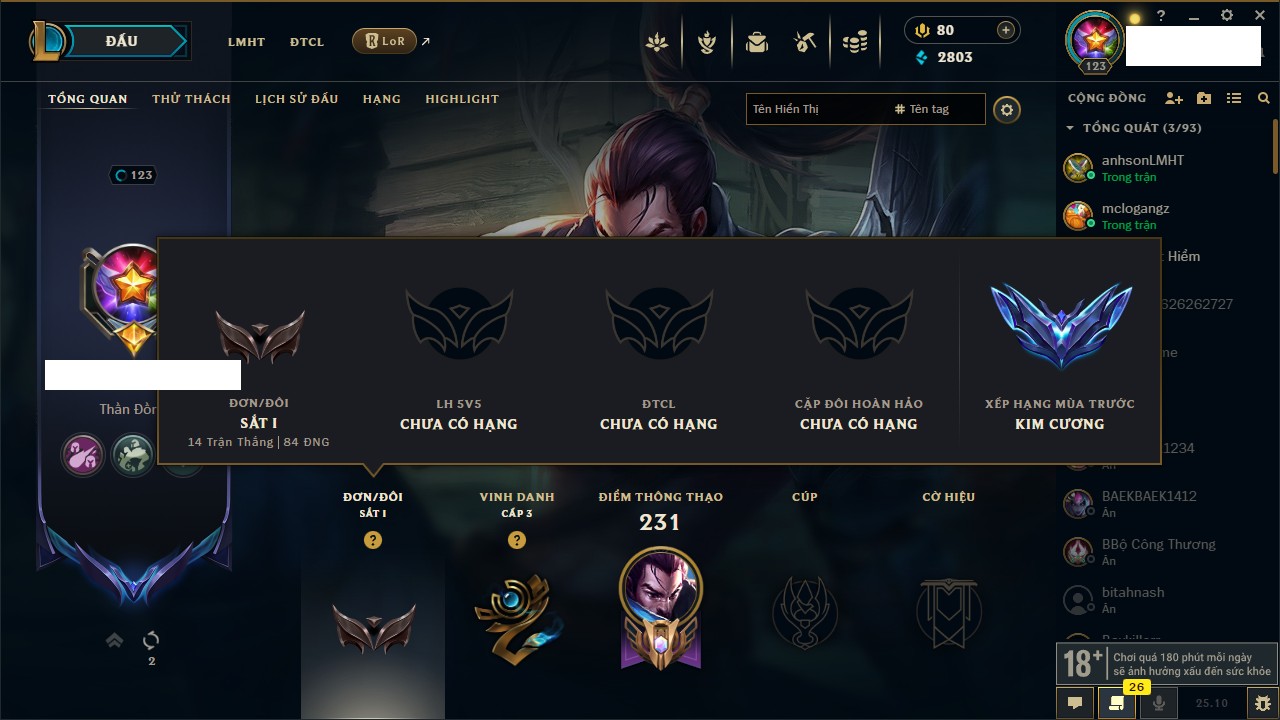 Rank Đơn: Vàng IKhung: Bạch kimTướng: 170 - Còn 212450 THXTrang Phục: 214Rank ĐTCL: Bạch Kim IVLinh Thú: 221