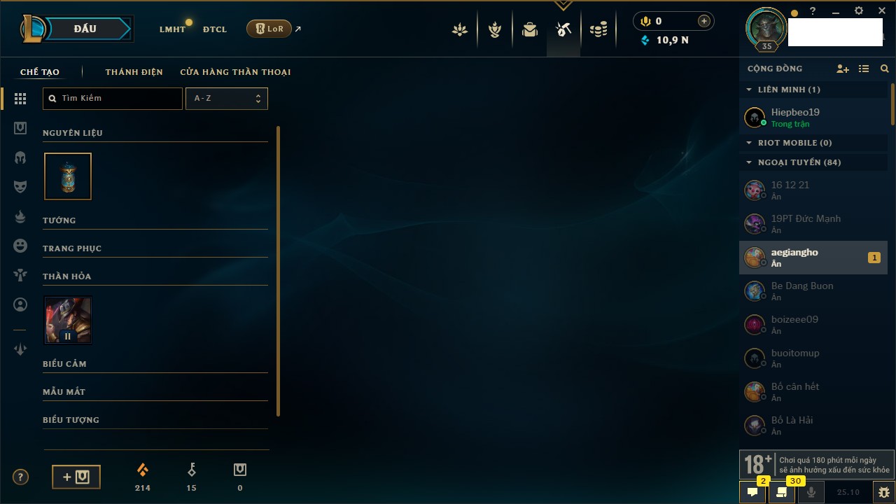 Rank Đơn: Vàng IIIKhung: Bạch kimTướng: 171 - Còn 98230 THXTrang Phục: 235Rank ĐTCL: Vàng IVLinh Thú: 59