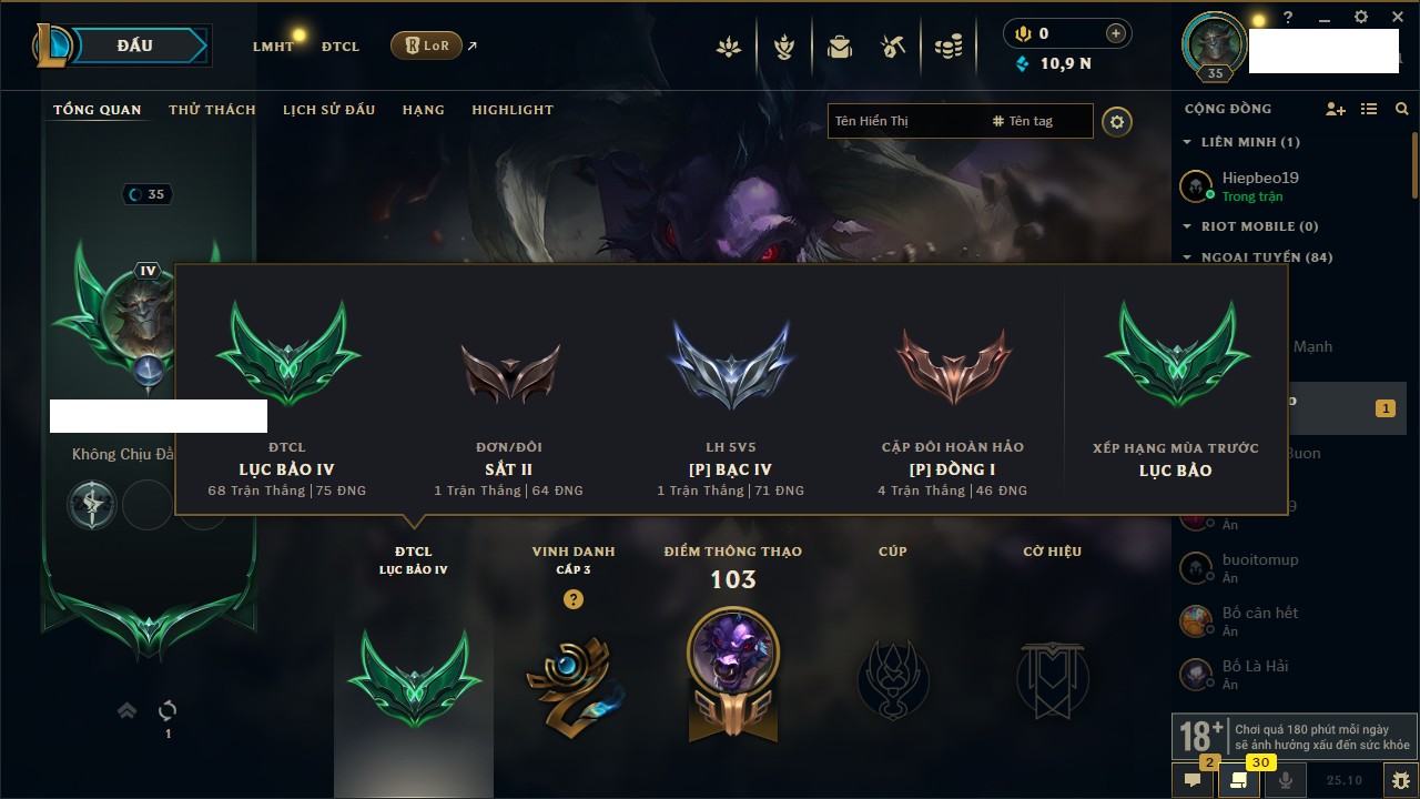 Rank Đơn: Bạc IVKhung: BạcTướng: 171 - Còn 173918 THXTrang Phục: 233Rank ĐTCL: Lục Bảo IIILinh Thú: 26