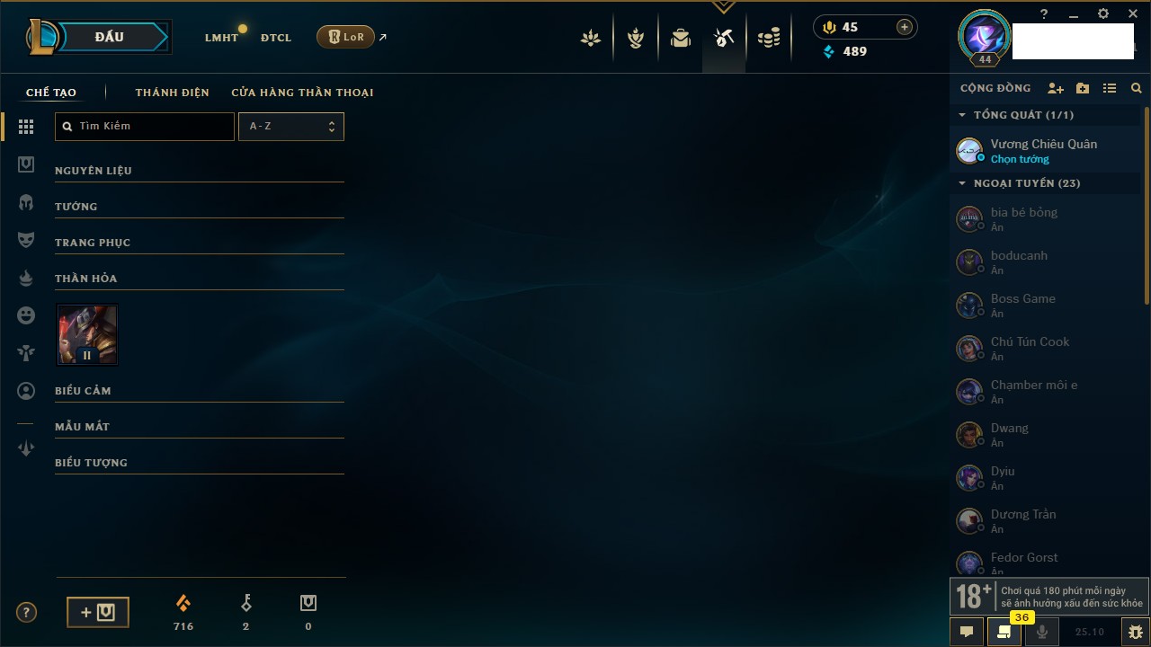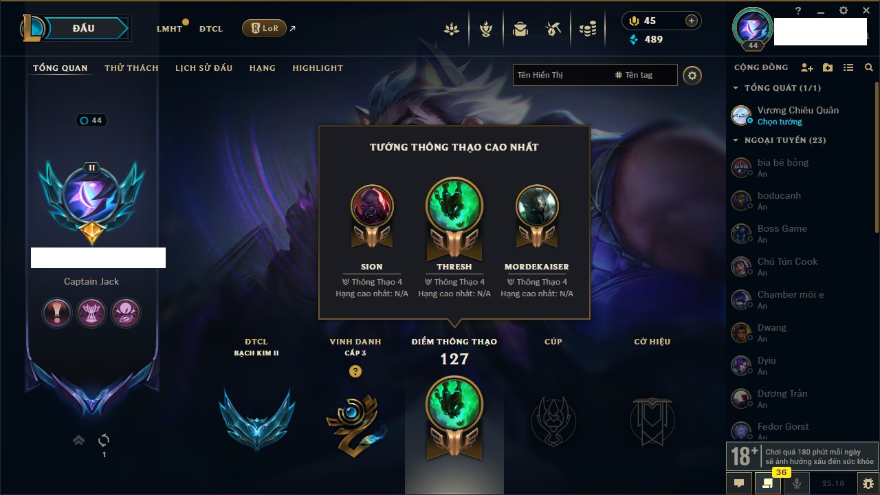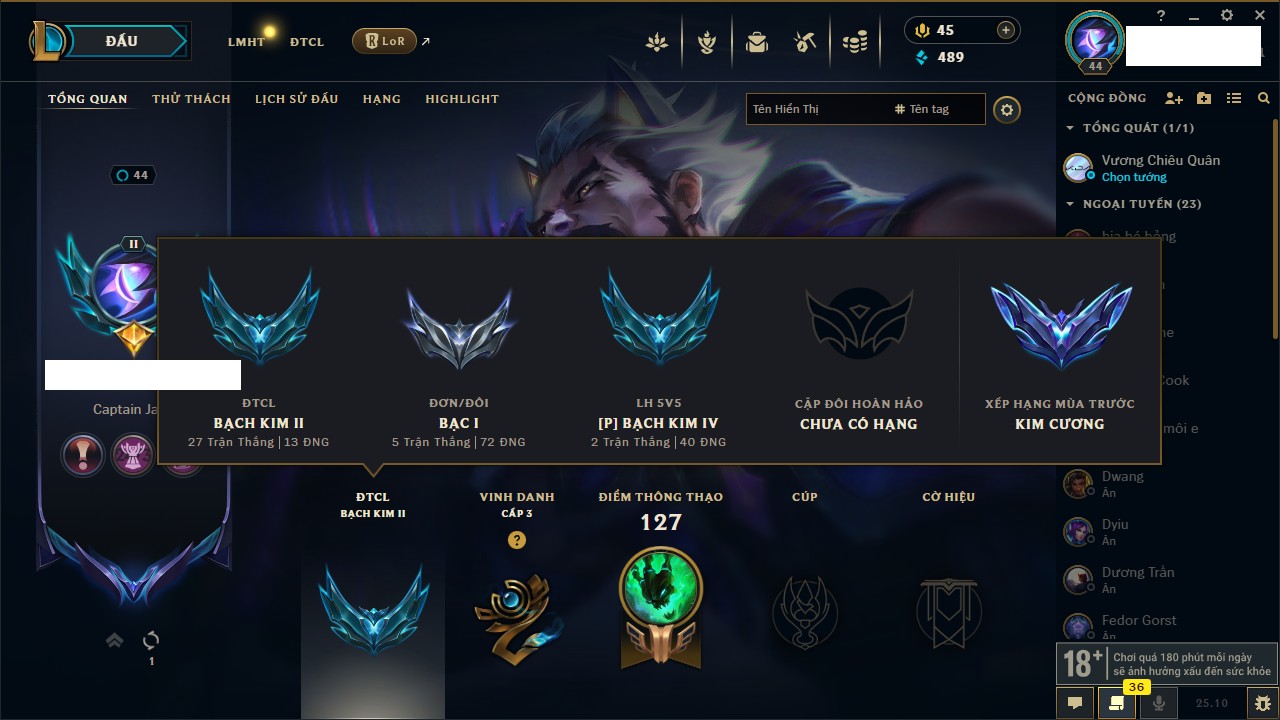 Rank Đơn: Bạch Kim IIKhung: Bạch kimTướng: 171 - Còn 316137 THXTrang Phục: 89Rank ĐTCL: Bạch Kim IIILinh Thú: 94