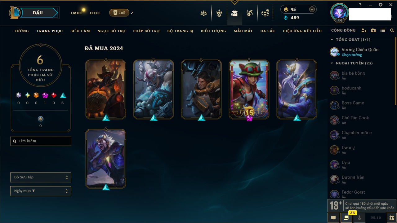 Rank Đơn: Vàng IIKhung: VàngTướng: 170 - Còn 243330 THXTrang Phục: 230Rank ĐTCL: Chưa RankLinh Thú: 68