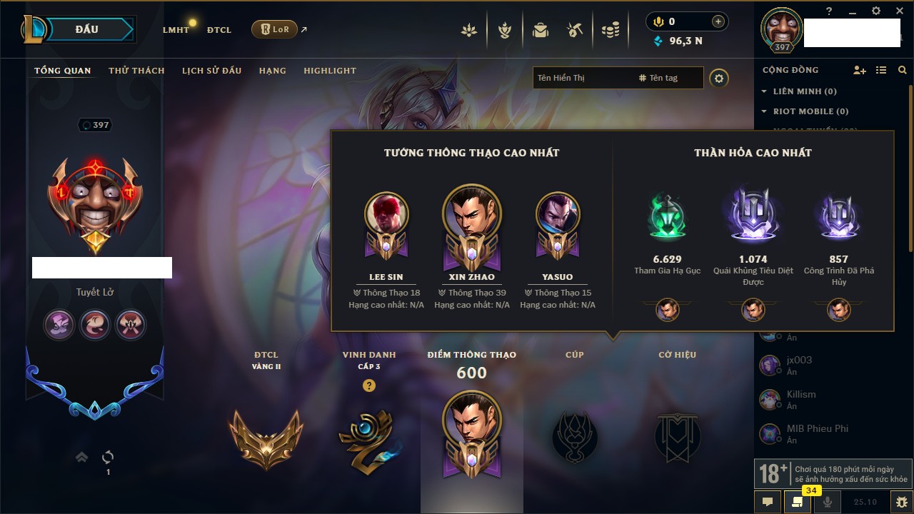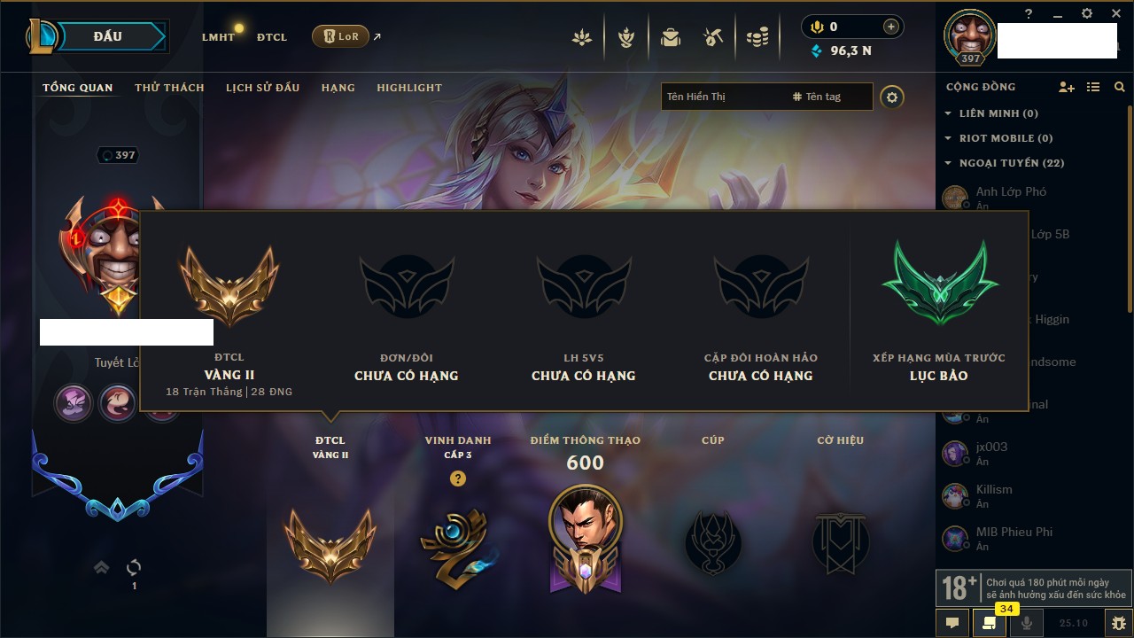 Rank Đơn: Vàng IKhung: Bạch kimTướng: 170 - Còn 212450 THXTrang Phục: 214Rank ĐTCL: Bạch Kim IVLinh Thú: 221