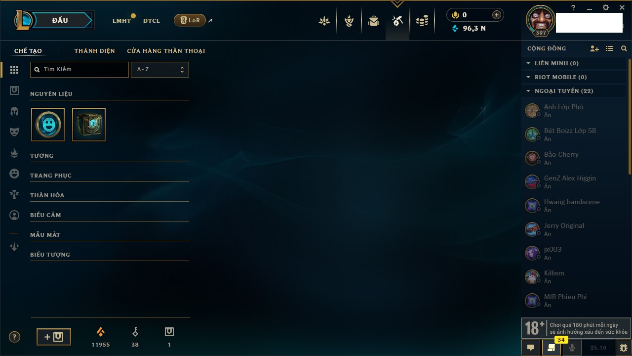 Rank Đơn: Bạch Kim IIKhung: Bạch kimTướng: 171 - Còn 263986 THXTrang Phục: 306Rank ĐTCL: Lục Bảo IVLinh Thú: 96