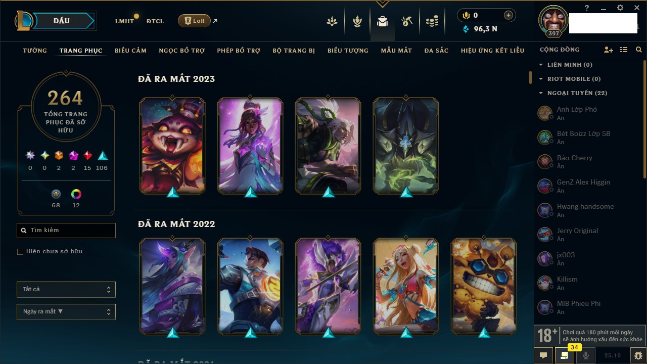 Rank Đơn: Vàng IIKhung: VàngTướng: 170 - Còn 330764 THXTrang Phục: 294Rank ĐTCL: Chưa RankLinh Thú: 58