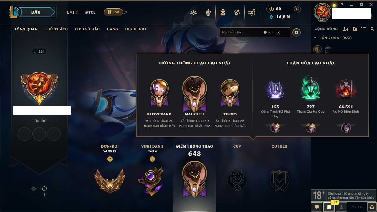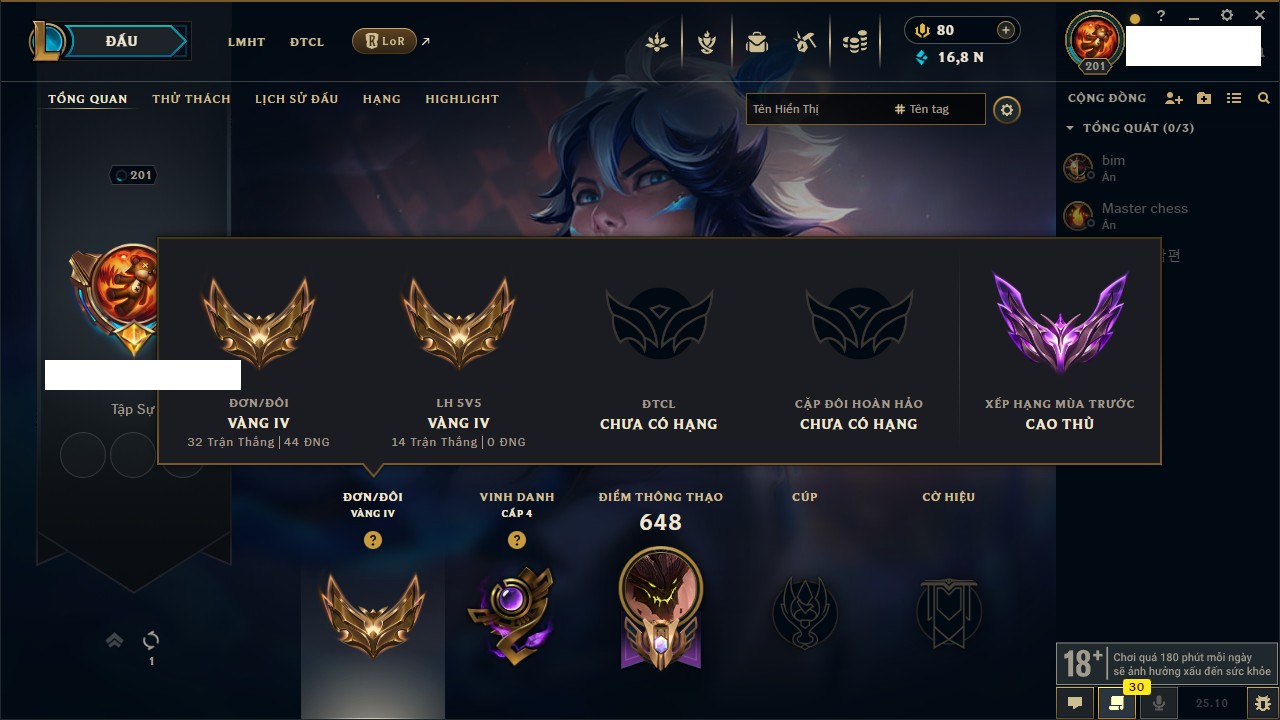 Rank Đơn: Bạc III Khung: Bạc Tướng: 170 - Còn 30078 THX Trang Phục: 225 Rank ĐTCL: Chưa Rank Linh Thú: 138