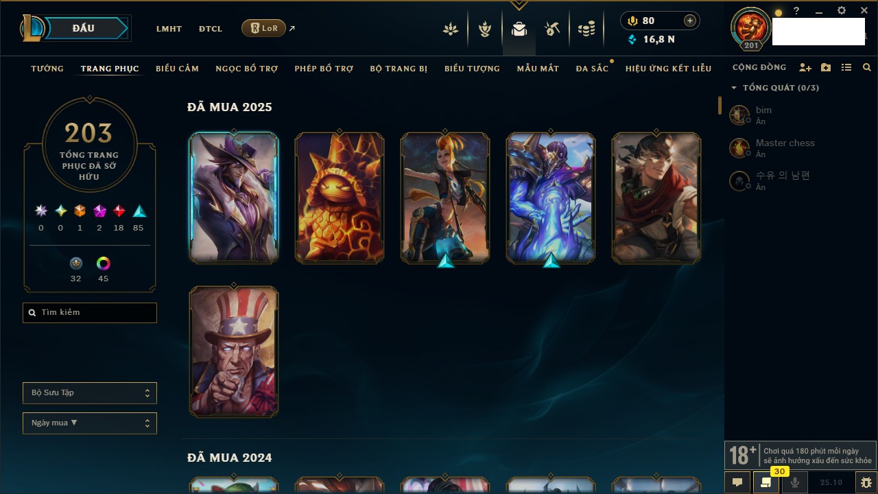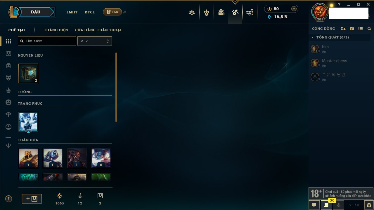 Rank Đơn: Vàng III Khung: Vàng Tướng: 171 - Còn 91047 THX Trang Phục: 98 Rank ĐTCL: Bạch Kim IV Linh Thú: 281