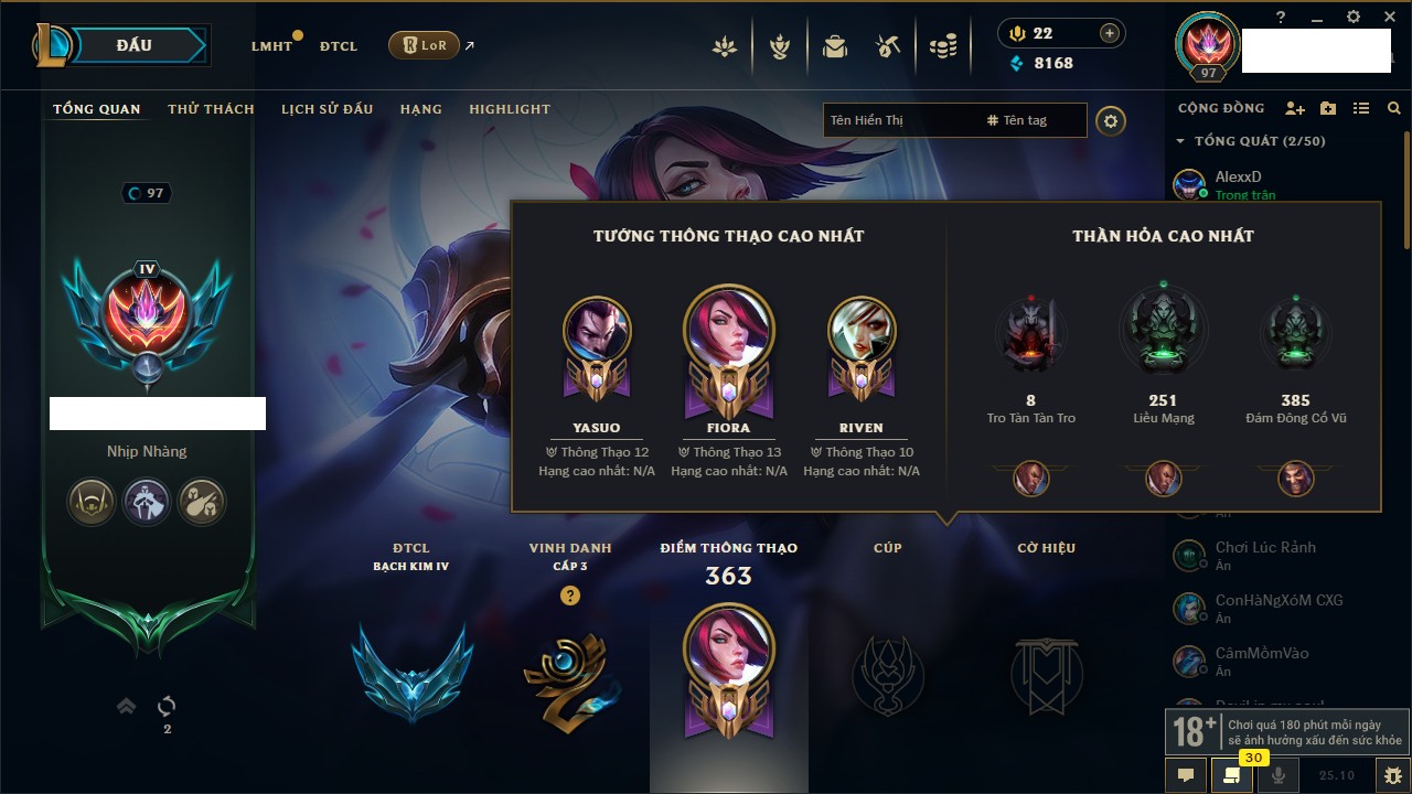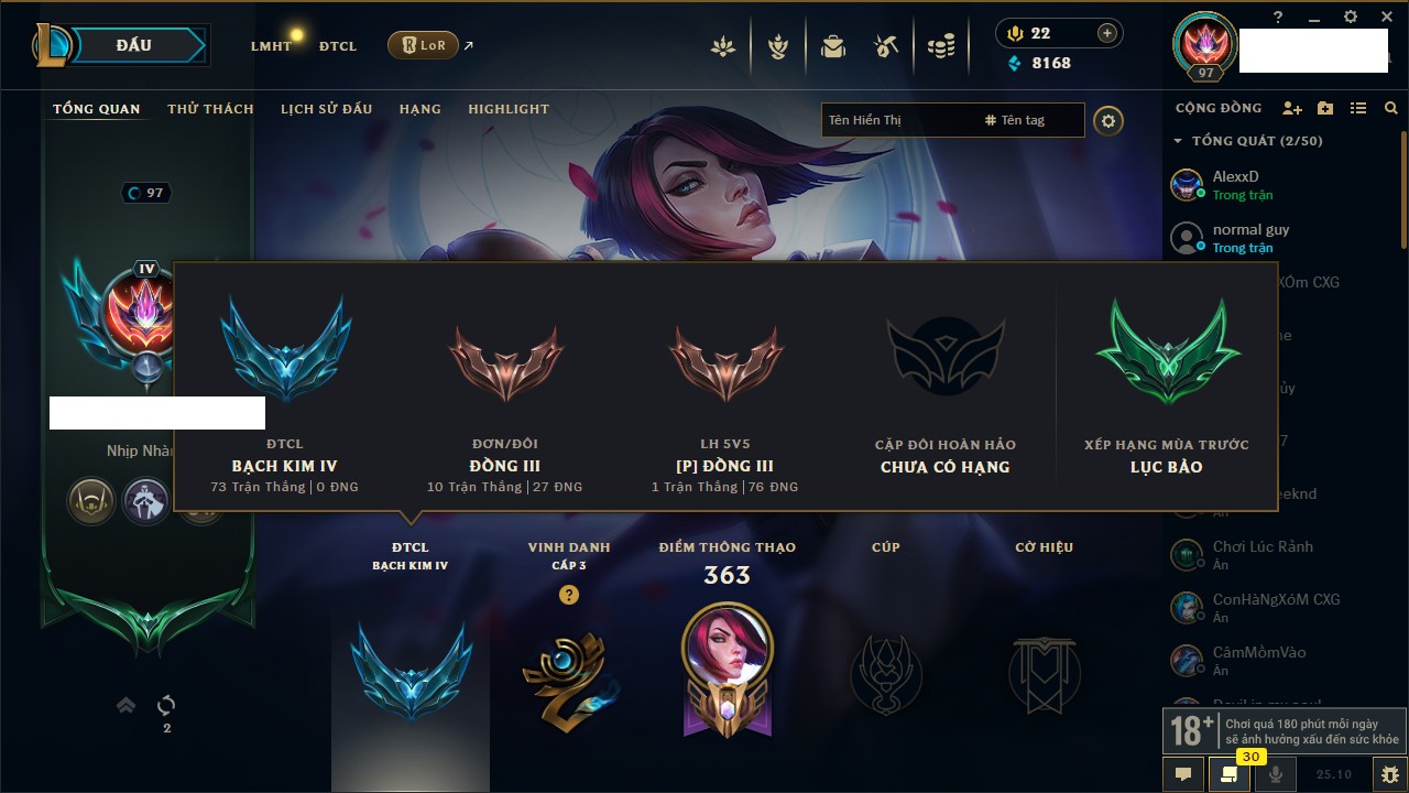 Rank Đơn: Vàng IKhung: Bạch kimTướng: 170 - Còn 212450 THXTrang Phục: 214Rank ĐTCL: Bạch Kim IVLinh Thú: 221