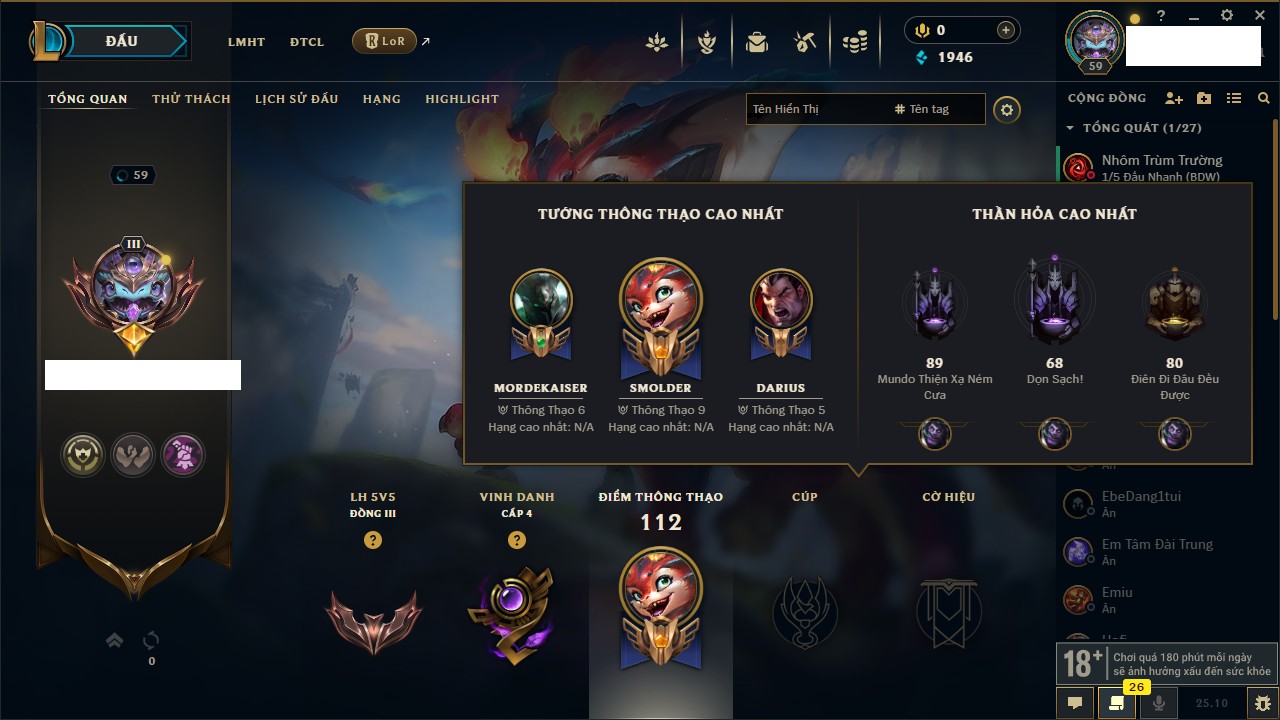 Rank Đơn: Bạch Kim IIKhung: Bạch kimTướng: 171 - Còn 316137 THXTrang Phục: 89Rank ĐTCL: Bạch Kim IIILinh Thú: 94