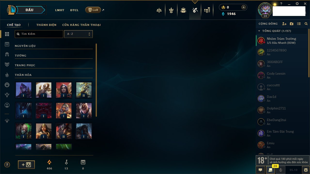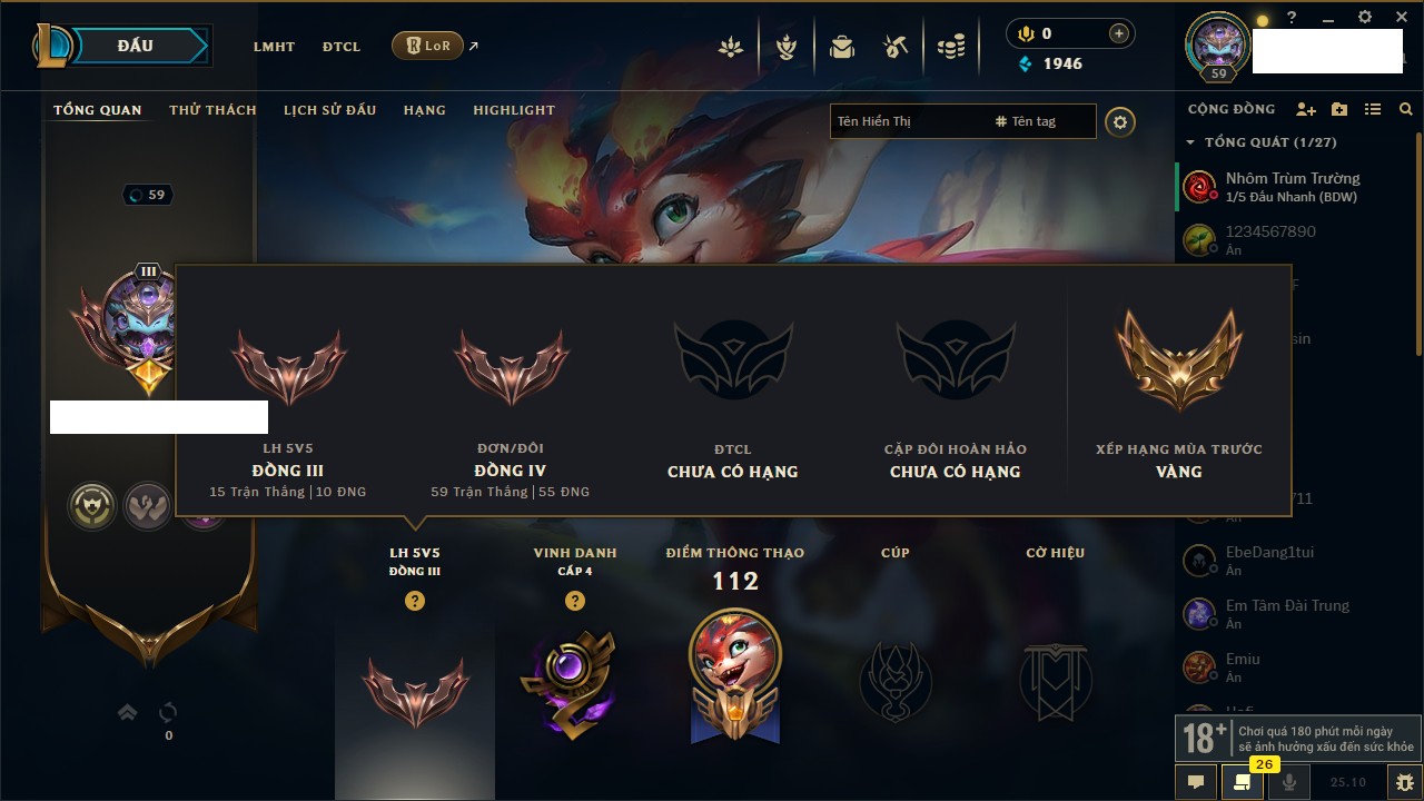 Rank Đơn: Lục Bảo IVKhung: VàngTướng: 171 - Còn 154648 THXTrang Phục: 203Rank ĐTCL: Bạch Kim IVLinh Thú: 69