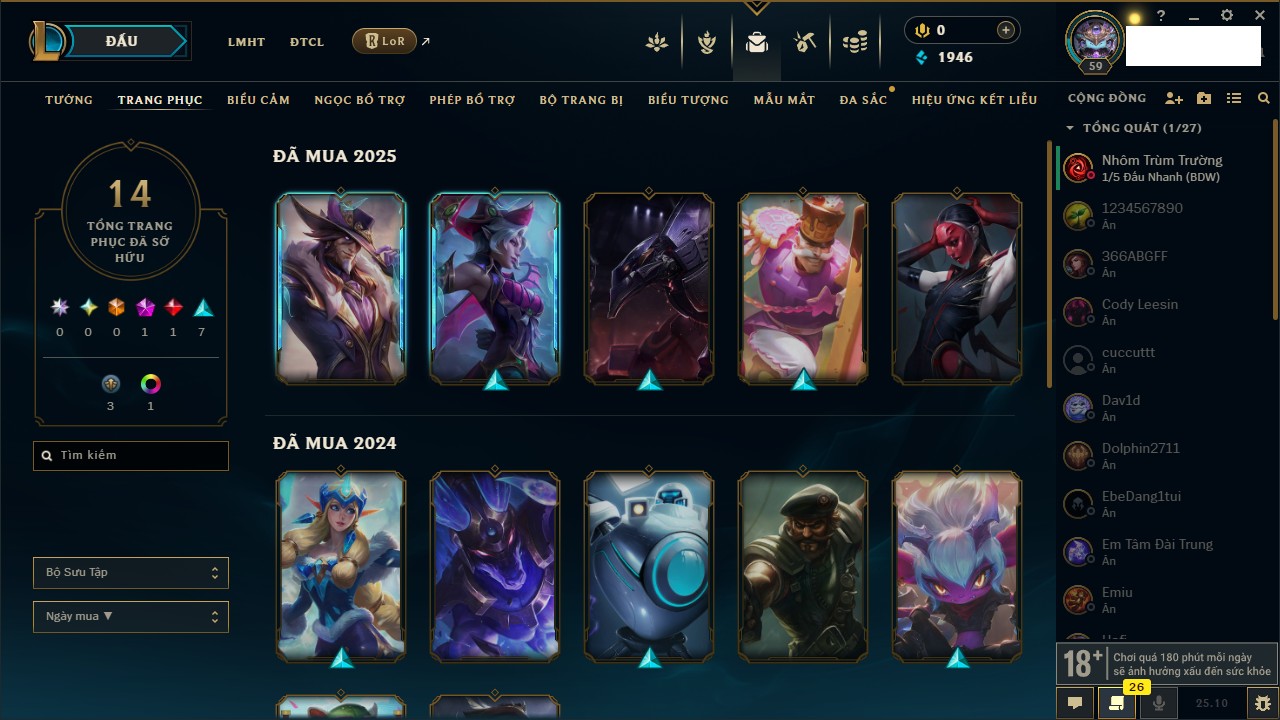 Rank Đơn: Vàng IIKhung: VàngTướng: 170 - Còn 243330 THXTrang Phục: 230Rank ĐTCL: Chưa RankLinh Thú: 68