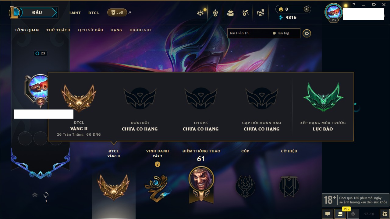 Rank Đơn: Bạc IIKhung: VàngTướng: 171 - Còn 332462 THXTrang Phục: 165Rank ĐTCL: Kim Cương IVLinh Thú: 181