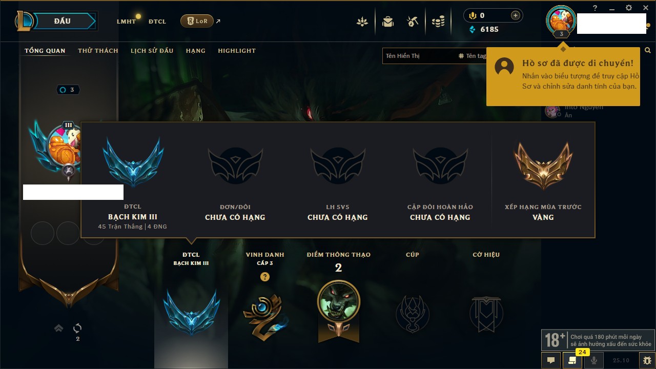 Rank Đơn: Chưa rank mùa nàoKhung: Chưa có khungTướng: 3 - Còn 34550 THXTrang Phục: 0Rank ĐTCL: Bạch Kim IVLinh Thú: 41