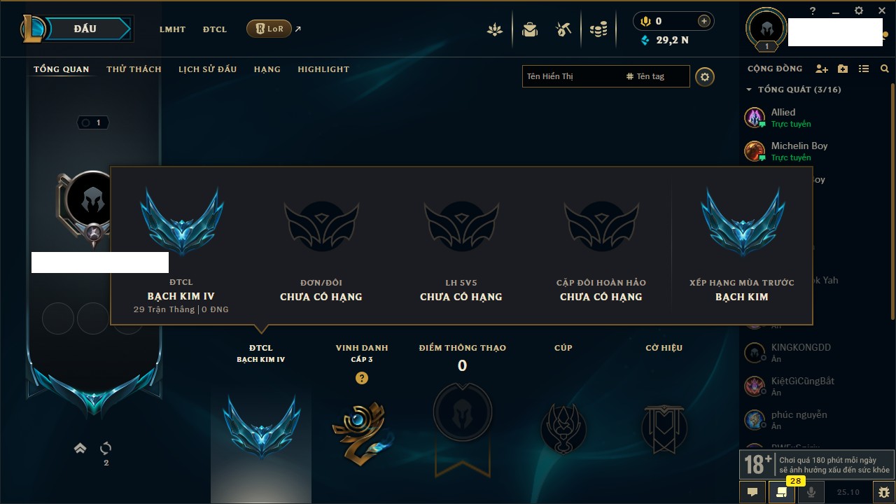 Rank Đơn: Vàng IIIKhung: BạcTướng: 171 - Còn 101359 THXTrang Phục: 88Rank ĐTCL: Kim Cương IVLinh Thú: 200