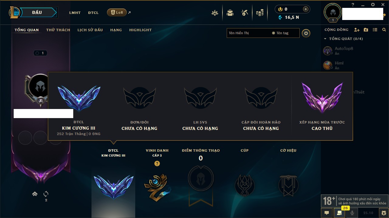 Rank Đơn: Vàng IIIKhung: VàngTướng: 172 - Còn 164704 THXTrang Phục: 255Rank ĐTCL: Kim Cương IVLinh Thú: 156