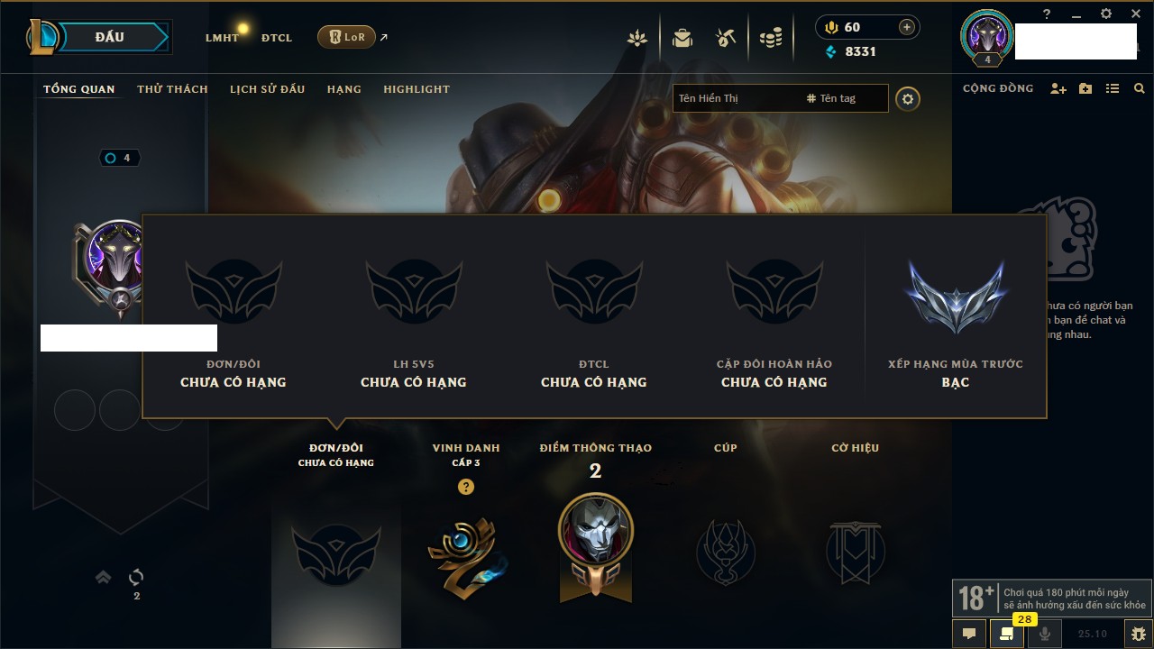 Rank Đơn: Sắt IVKhung: SắtTướng: 171 - Còn 231744 THXTrang Phục: 376Rank ĐTCL: Bạch Kim IILinh Thú: 120