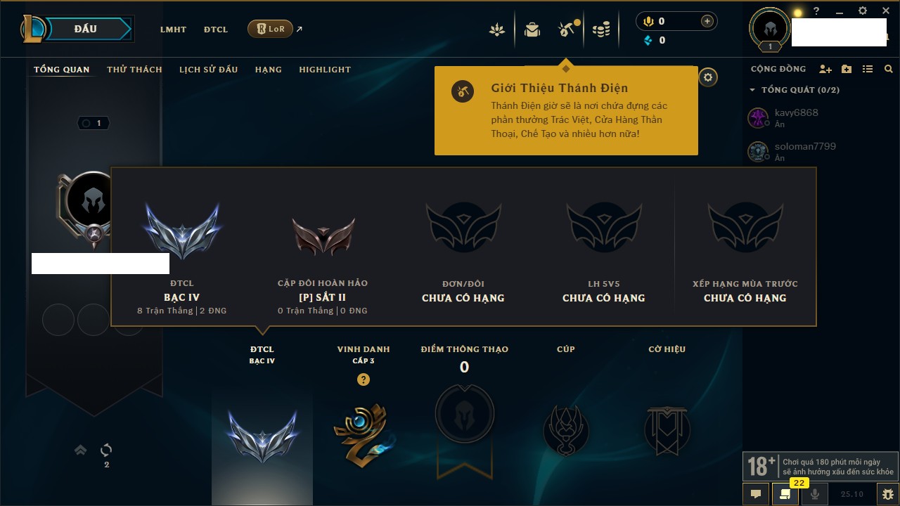 Rank Đơn: Chưa rank mùa nàoKhung: Chưa có khungTướng: 10 - Còn 21800 THXTrang Phục: 0Rank ĐTCL: Bạc ILinh Thú: 33