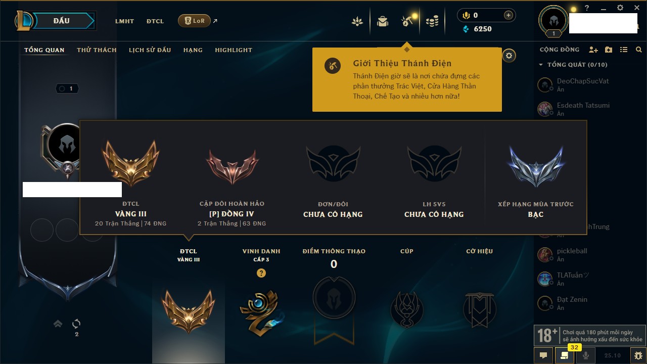 Rank Đơn: Chưa rank mùa nàoKhung: Chưa có khungTướng: 0 - Còn 6300 THXTrang Phục: 0Rank ĐTCL: Bạc IIILinh Thú: 3