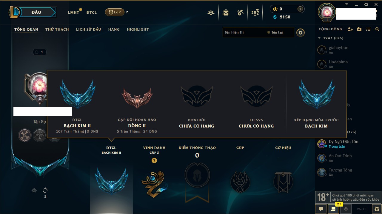 Rank Đơn: Vàng IKhung: Bạch kimTướng: 170 - Còn 212450 THXTrang Phục: 214Rank ĐTCL: Bạch Kim IVLinh Thú: 221
