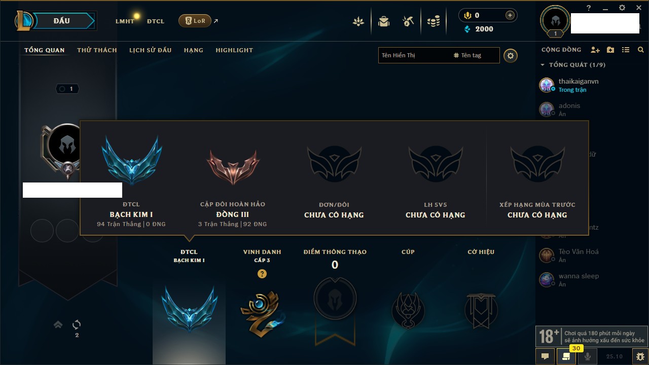 Rank Đơn: Chưa rank mùa nàoKhung: Chưa có khungTướng: 3 - Còn 34550 THXTrang Phục: 0Rank ĐTCL: Bạch Kim IVLinh Thú: 41