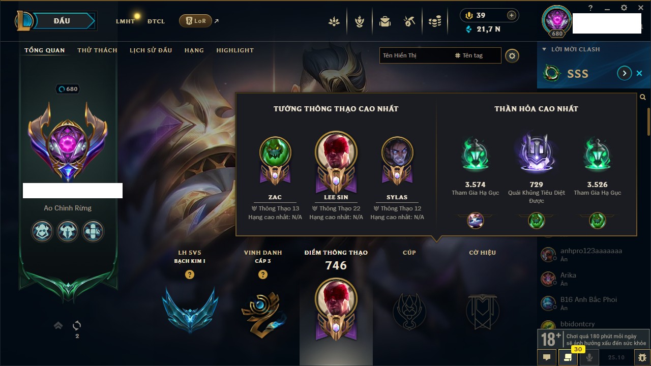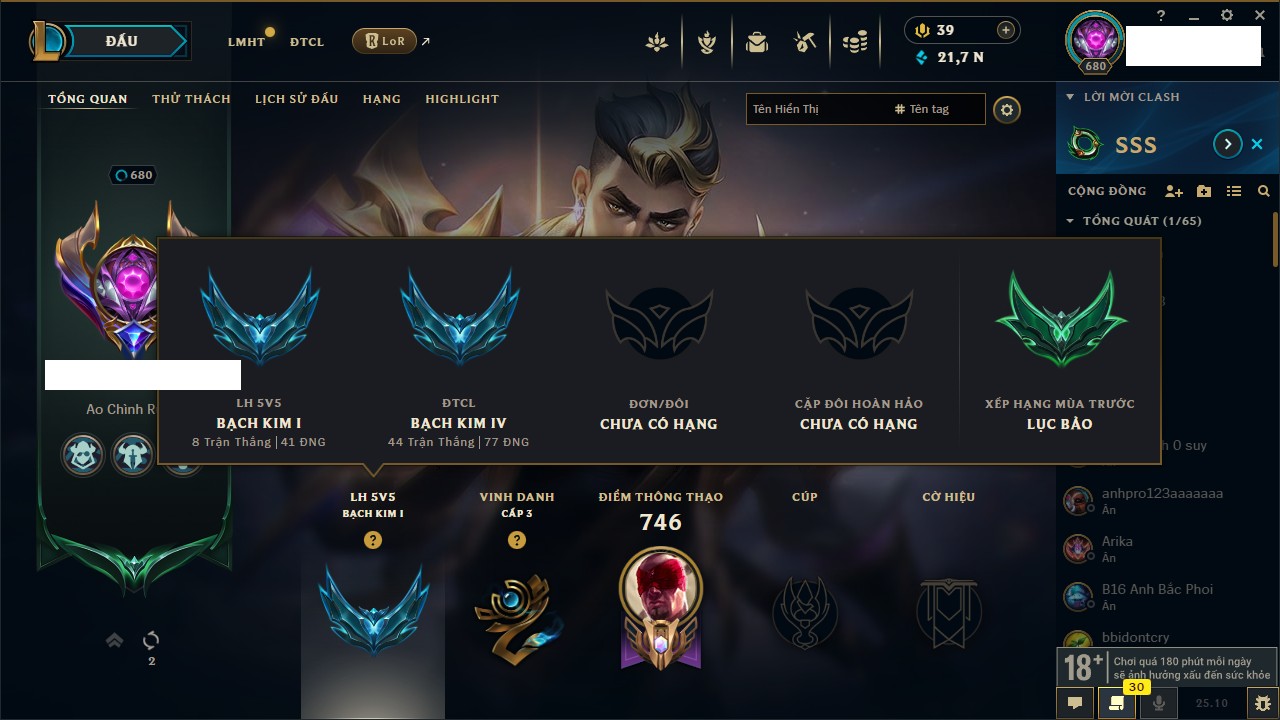 Rank Đơn: Chưa RankKhung: Chưa có khungTướng: 154 - Còn 68393 THXTrang Phục: 137Rank ĐTCL: Chưa RankLinh Thú: 2