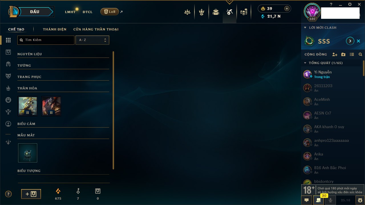 Rank Đơn: Chưa RankKhung: Chưa có khungTướng: 162 - Còn 144 THXTrang Phục: 506Rank ĐTCL: Chưa RankLinh Thú: 190