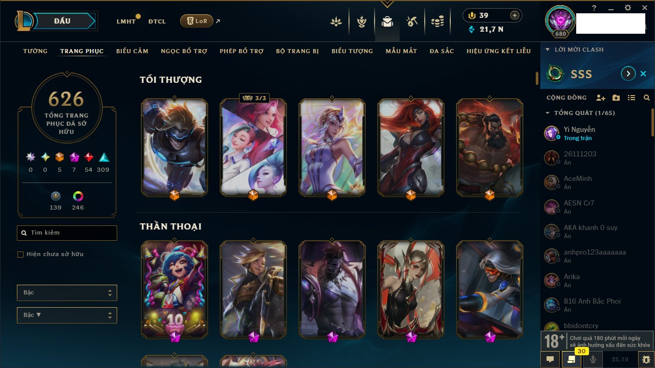 Rank Đơn: Vàng IKhung: VàngTướng: 168 - Còn 139249 THXTrang Phục: 115Rank ĐTCL: Lục Bảo IIILinh Thú: 139
