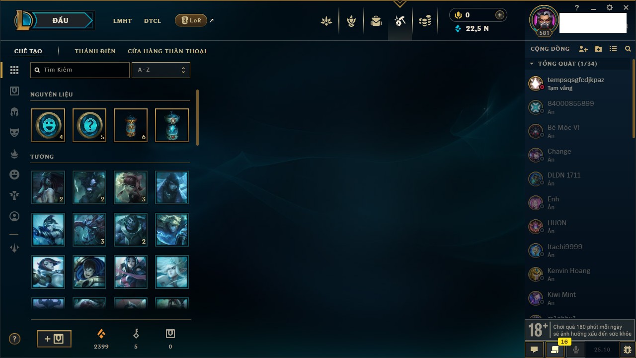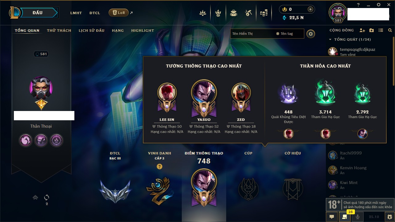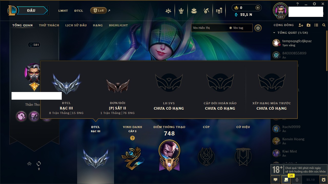Rank Đơn: Vàng IKhung: BạcTướng: 171 - Còn 60584 THXTrang Phục: 286Rank ĐTCL: Vàng IIILinh Thú: 117