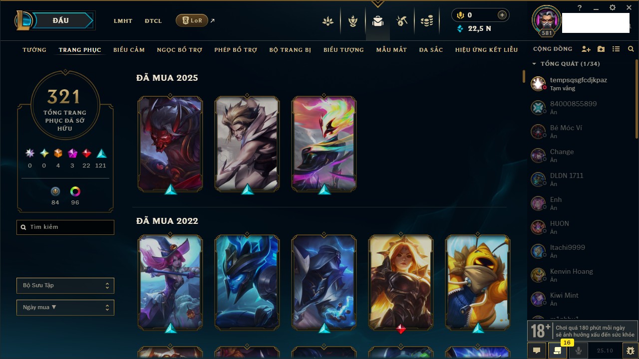 Rank Đơn: Vàng IIIKhung: VàngTướng: 171 - Còn 88128 THXTrang Phục: 329Rank ĐTCL: Chưa RankLinh Thú: 41