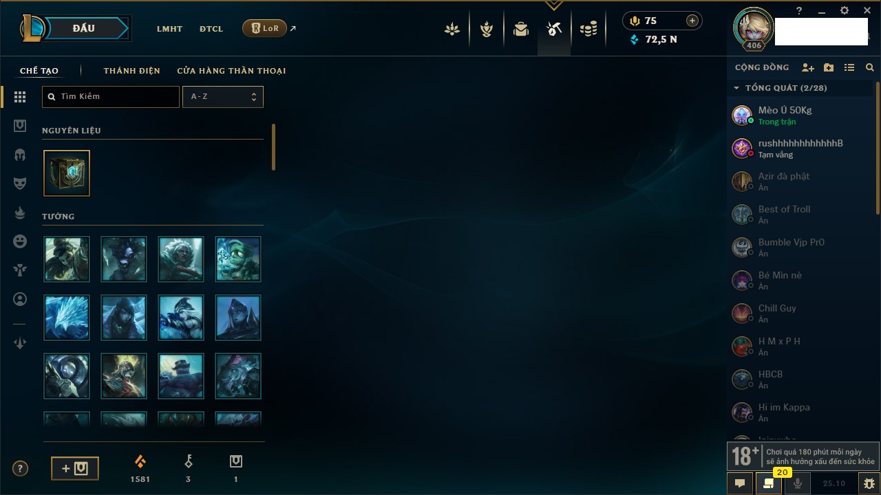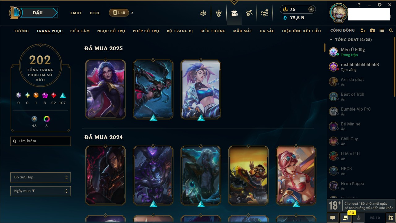 Rank Đơn: Chưa RankKhung: Chưa có khungTướng: 170 - Còn 72514 THXTrang Phục: 202Rank ĐTCL: Chưa RankLinh Thú: 191