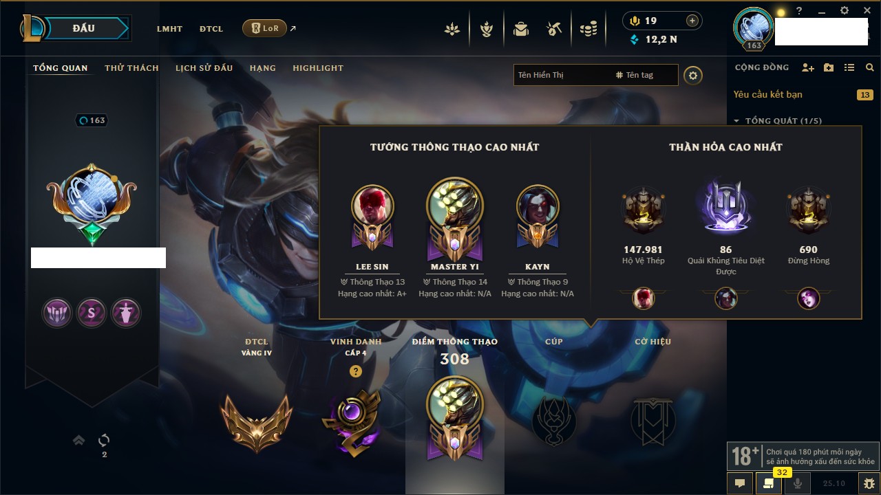 Rank Đơn: Vàng IVKhung: VàngTướng: 158 - Còn 85629 THXTrang Phục: 163Rank ĐTCL: Chưa RankLinh Thú: 177