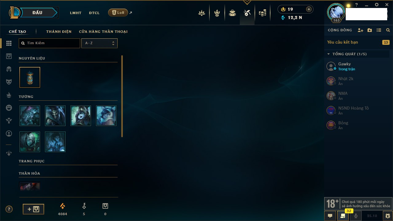 Rank Đơn: Chưa RankKhung: Chưa có khungTướng: 162 - Còn 12067 THXTrang Phục: 175Rank ĐTCL: Chưa RankLinh Thú: 22