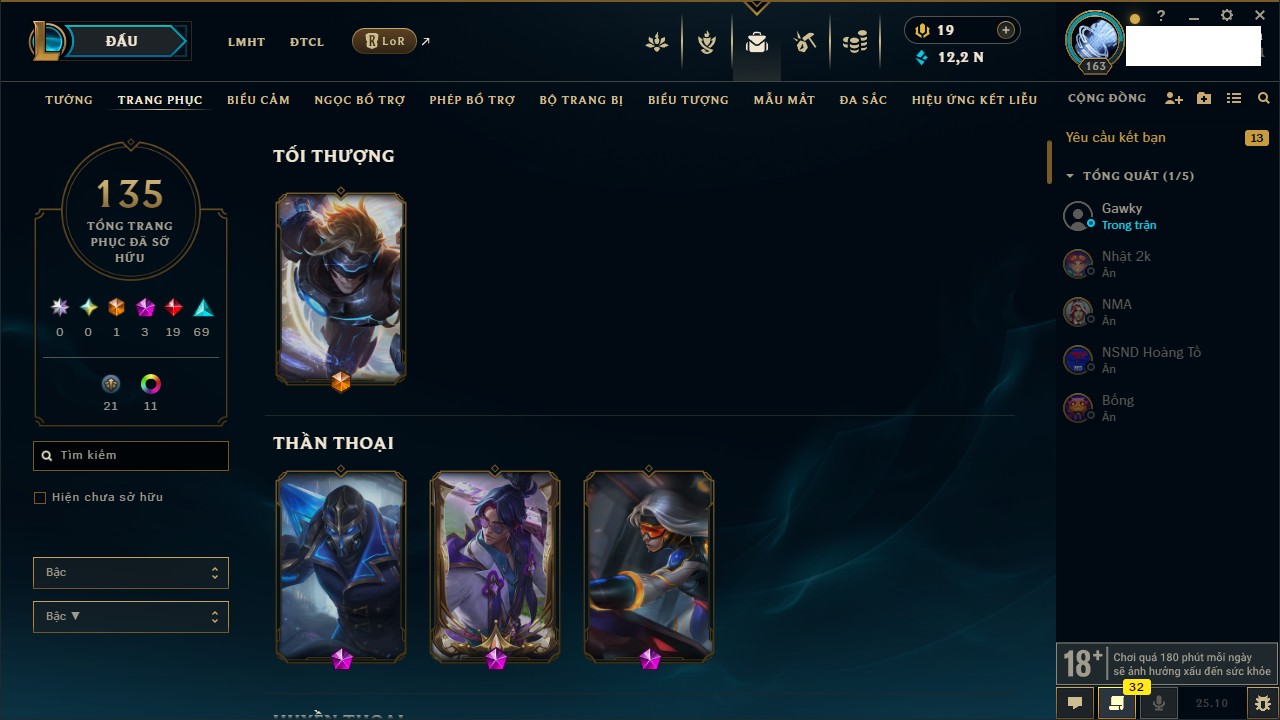 Rank Đơn: Vàng IKhung: Chưa có khungTướng: 168 - Còn 2976 THXTrang Phục: 154Rank ĐTCL: Chưa RankLinh Thú: 81