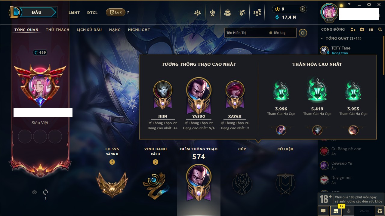 Rank Đơn: Vàng IIKhung: VàngTướng: 171 - Còn 34018 THXTrang Phục: 250Rank ĐTCL: Sắt IILinh Thú: 19