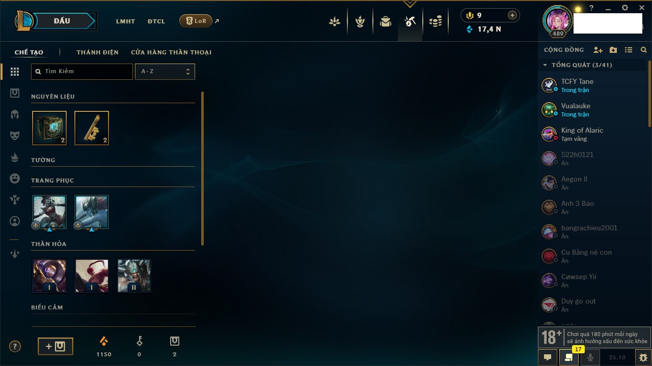 Rank Đơn: Bạc IIIKhung: Chưa có khungTướng: 171 - Còn 21493 THXTrang Phục: 252Rank ĐTCL: Bạch Kim IVLinh Thú: 123