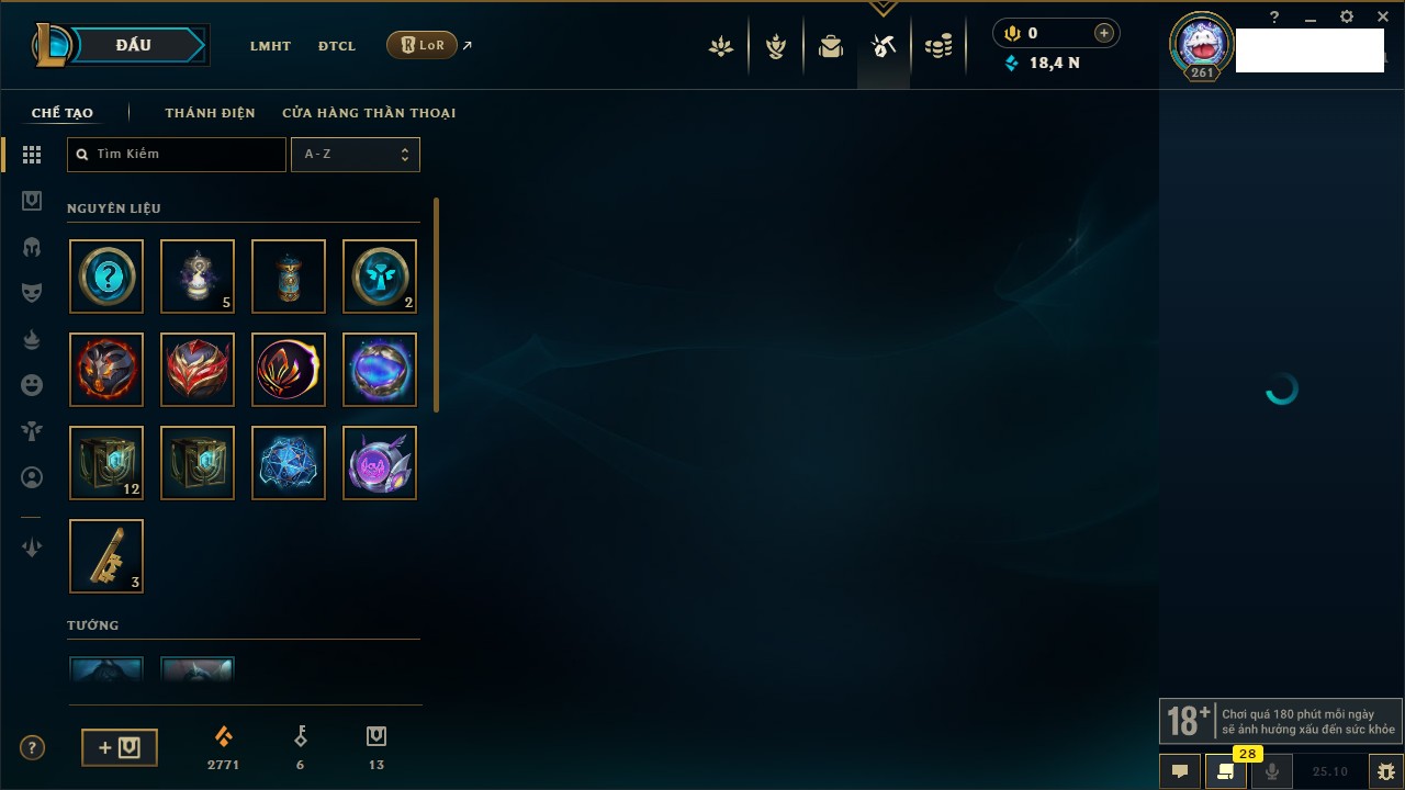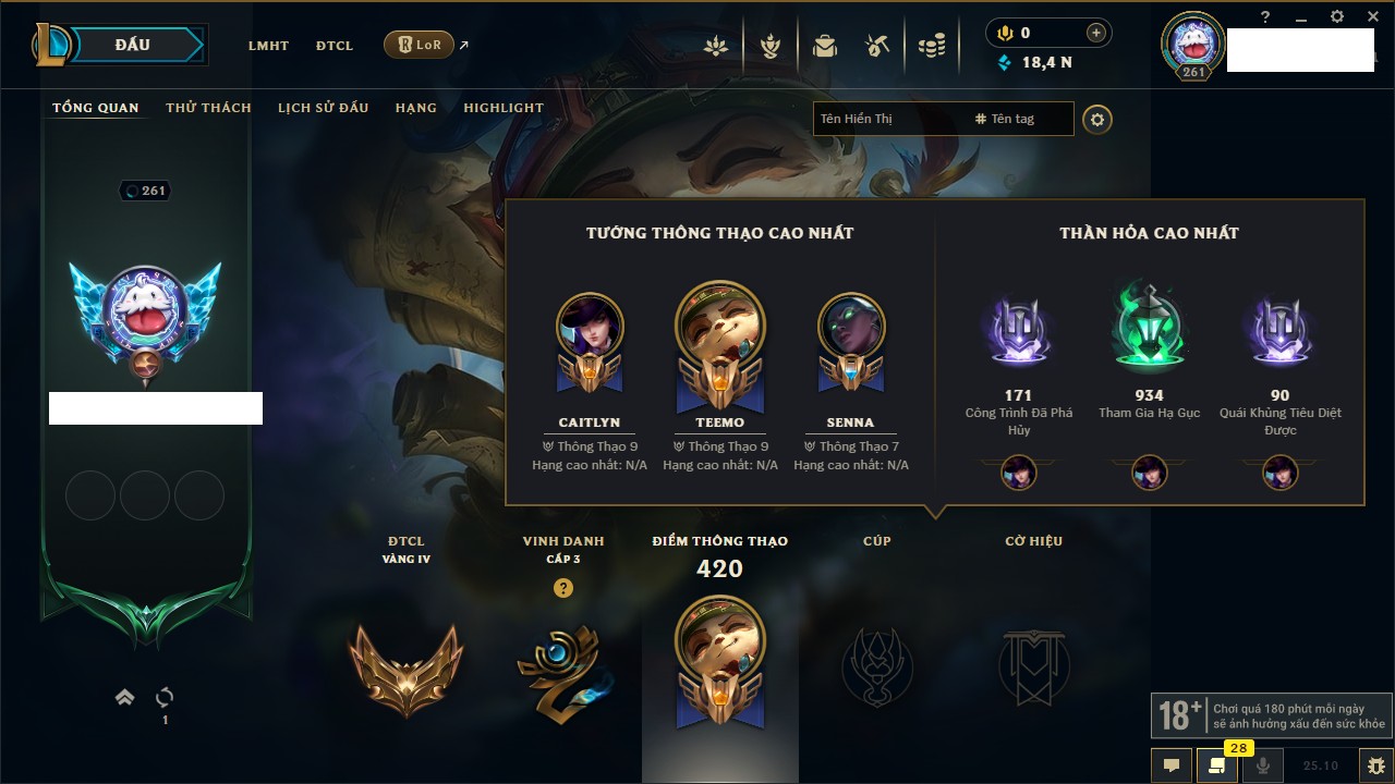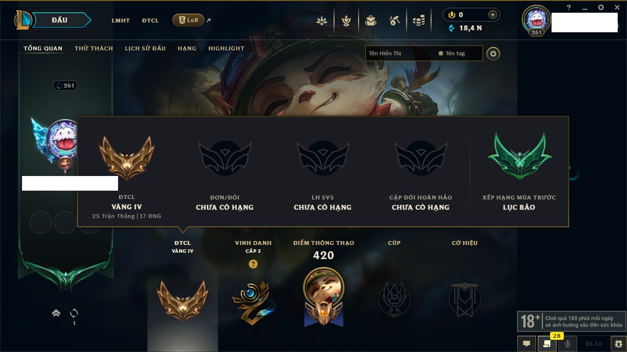 Rank Đơn: Sắt IVKhung: SắtTướng: 171 - Còn 231744 THXTrang Phục: 376Rank ĐTCL: Bạch Kim IILinh Thú: 120