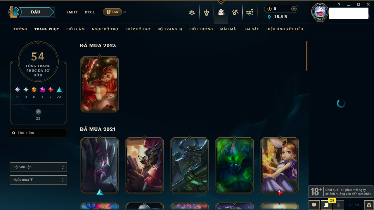 Rank Đơn: Bạc IIKhung: Bạch kimTướng: 169 - Còn 81813 THXTrang Phục: 301Rank ĐTCL: Chưa RankLinh Thú: 140