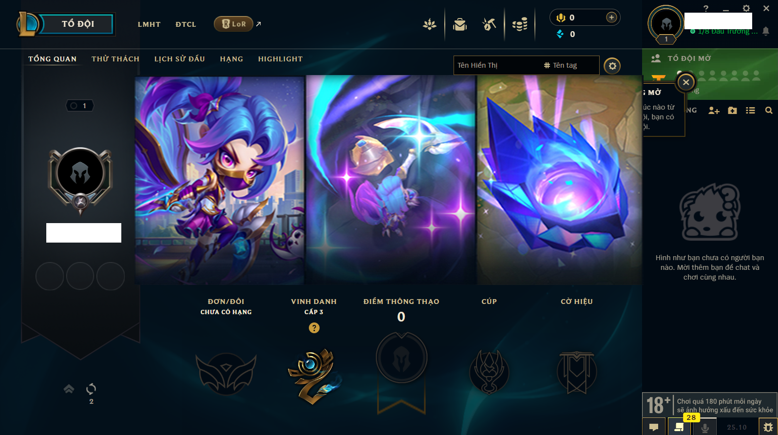Rank Đơn: Vàng IIIKhung: BạcTướng: 171 - Còn 101359 THXTrang Phục: 88Rank ĐTCL: Kim Cương IVLinh Thú: 200