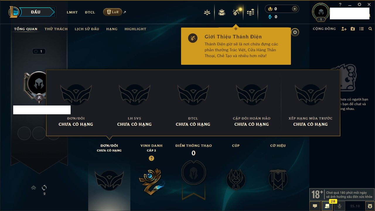 Rank Đơn: Vàng IIIKhung: BạcTướng: 171 - Còn 101359 THXTrang Phục: 88Rank ĐTCL: Kim Cương IVLinh Thú: 200