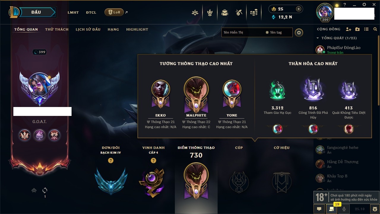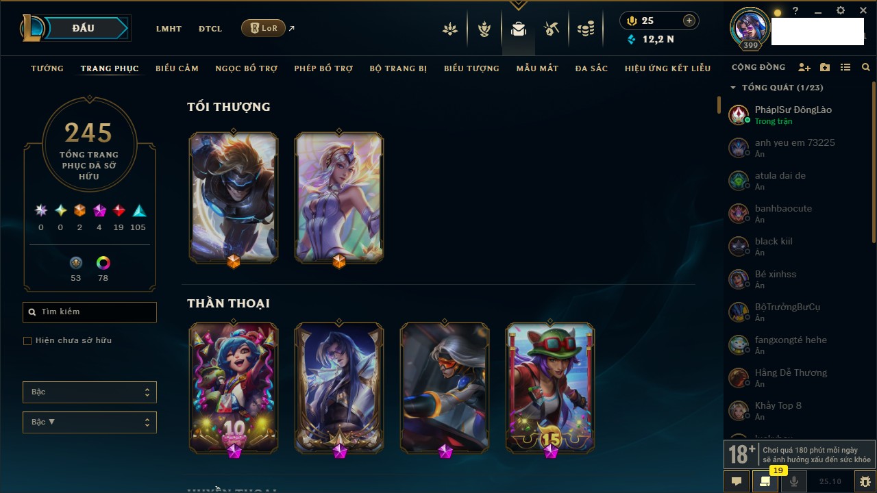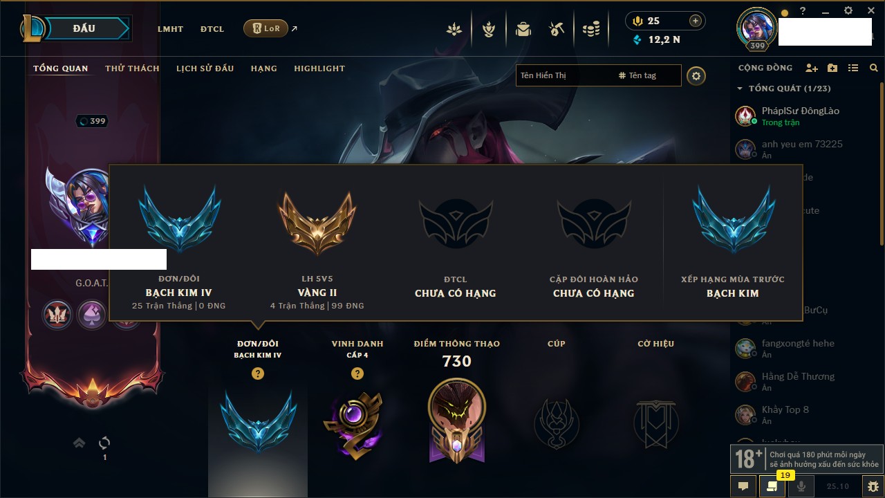 Rank Đơn: Vàng IKhung: Bạch kimTướng: 170 - Còn 212450 THXTrang Phục: 214Rank ĐTCL: Bạch Kim IVLinh Thú: 221