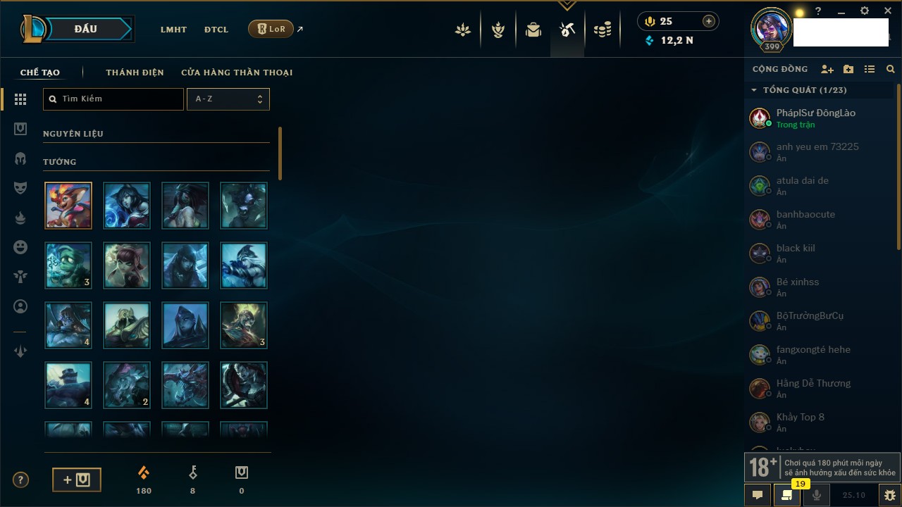 Rank Đơn: Vàng IVKhung: VàngTướng: 172 - Còn 2742 THXTrang Phục: 367Rank ĐTCL: Chưa RankLinh Thú: 214