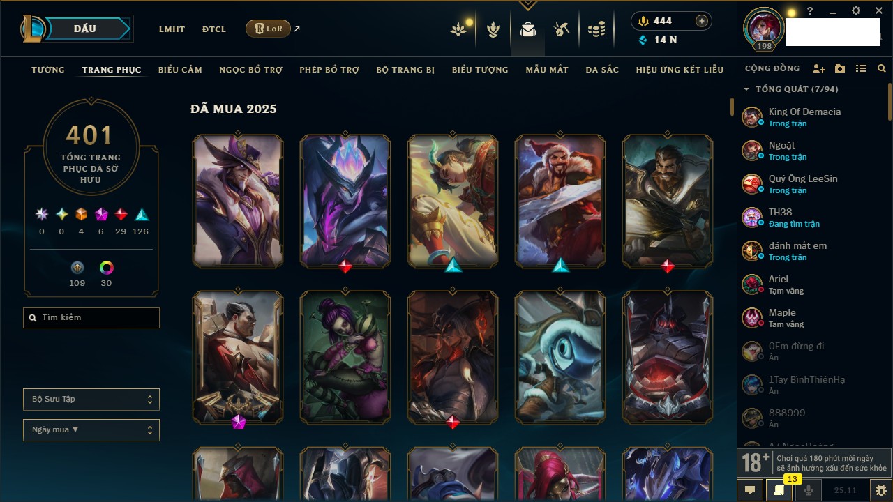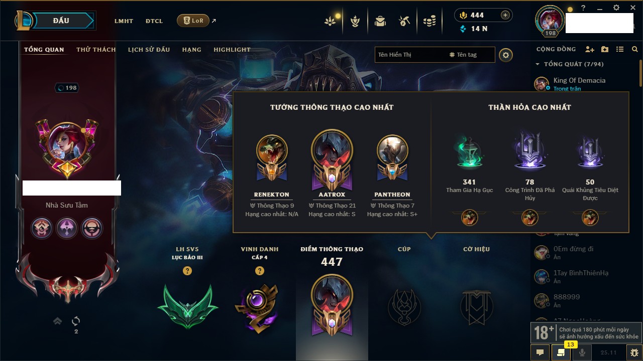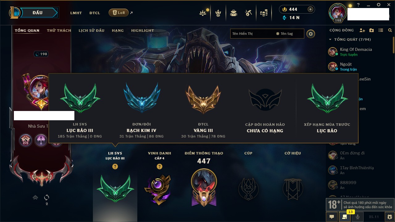 Rank Đơn: Vàng IKhung: Bạch kimTướng: 170 - Còn 212450 THXTrang Phục: 214Rank ĐTCL: Bạch Kim IVLinh Thú: 221