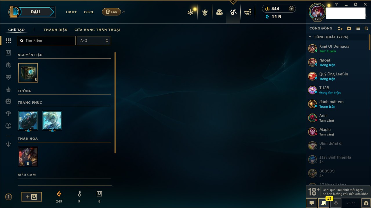 Rank Đơn: Bạch Kim IIKhung: Bạch kimTướng: 171 - Còn 263986 THXTrang Phục: 306Rank ĐTCL: Lục Bảo IVLinh Thú: 96