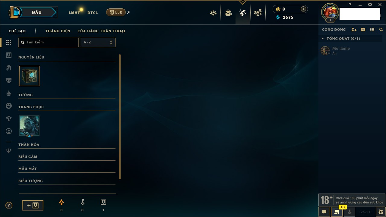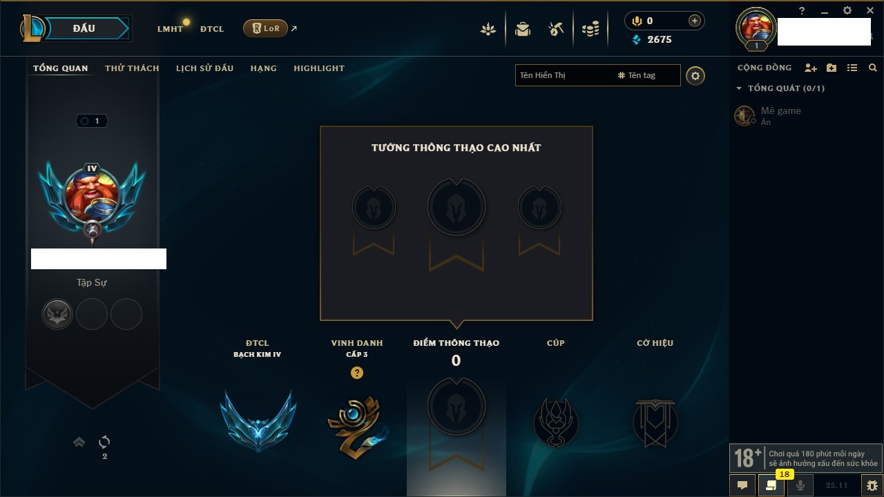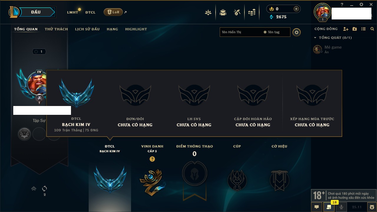 Rank Đơn: Chưa rank mùa nàoKhung: Chưa có khungTướng: 156 - Còn 18550 THXTrang Phục: 4Rank ĐTCL: Chưa RankLinh Thú: 75