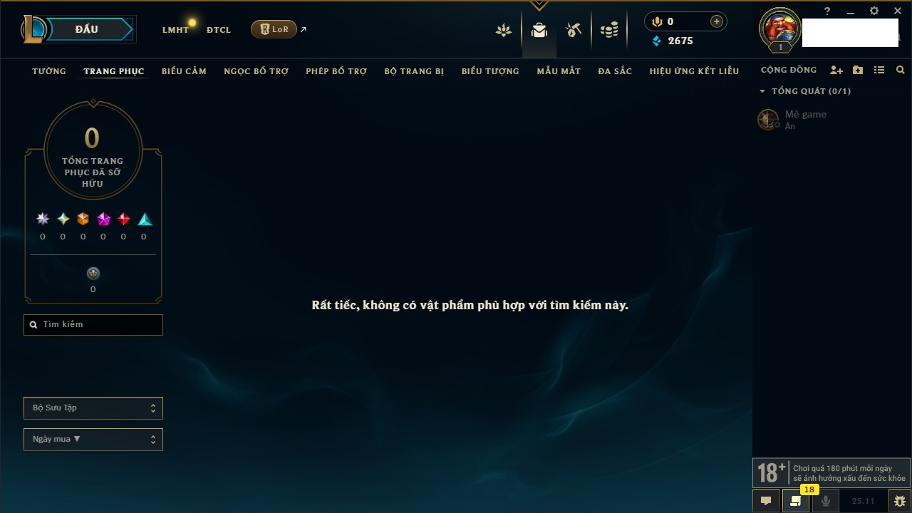 Rank Đơn: Chưa rank mùa nàoKhung: Chưa có khungTướng: 159 - Còn 15030 THXTrang Phục: 5Rank ĐTCL: Chưa RankLinh Thú: 51