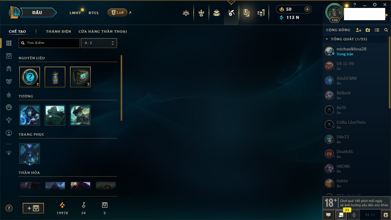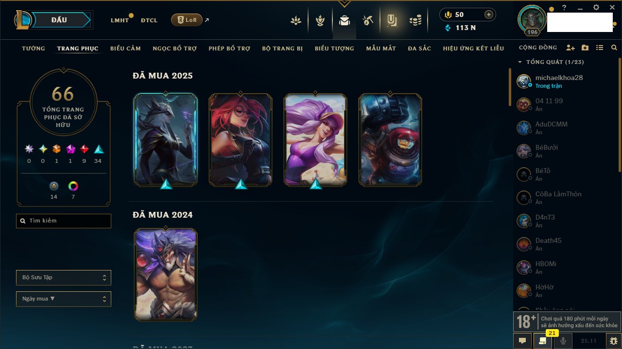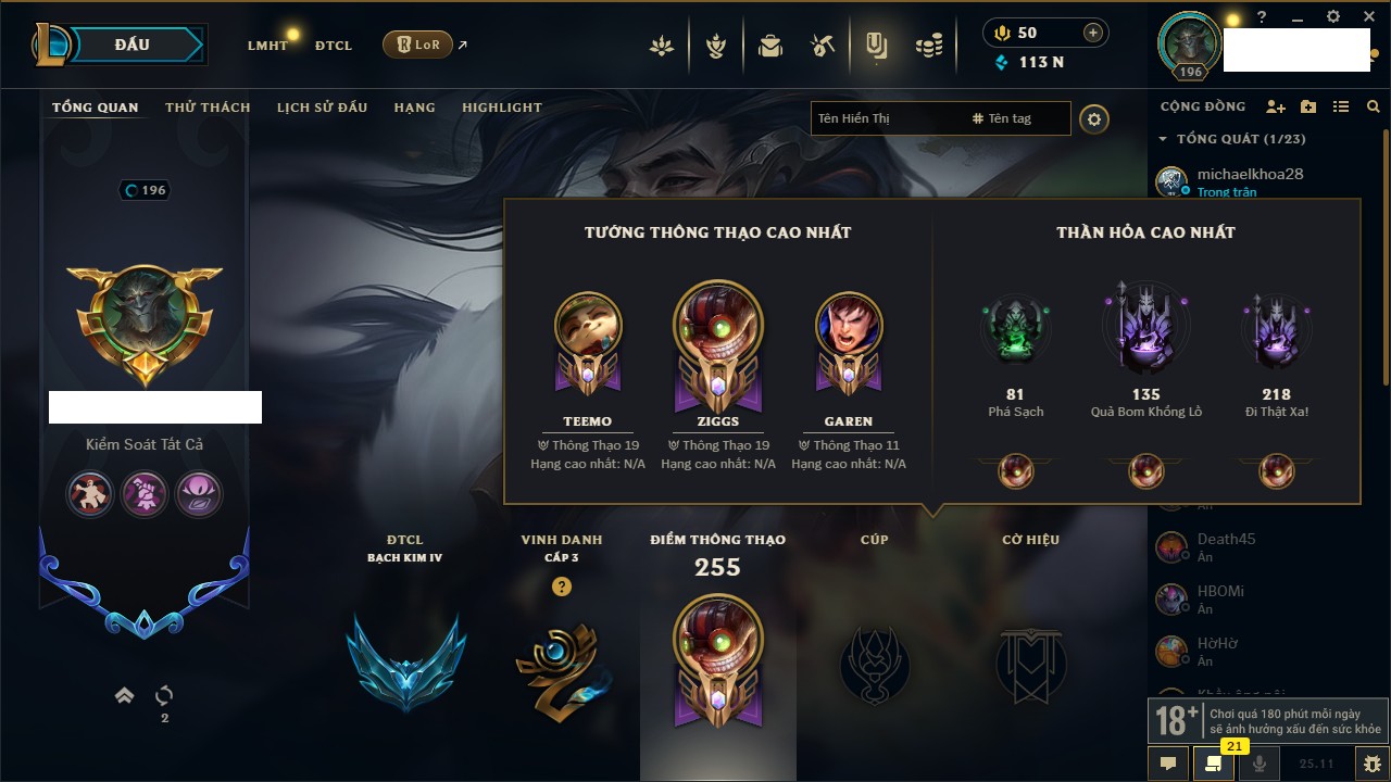 Rank Đơn: Chưa rank mùa nào Khung: Chưa có khung Tướng: 35 - Còn 21851 THX Trang Phục: 3 Rank ĐTCL: Bạch Kim IV Linh Thú: 144